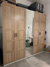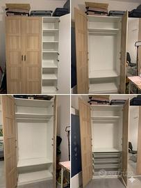 Armadio IKEA a 5 ante, spazioso e funzionale. • Anta centrale singola con 6 mensole regolabili • Due sezioni laterali (con doppie ante): • Entrambe con ripiano superiore tipo soppalco • Spazio centrale con appendiabiti • Parte inferiore: • Sinistra: ripiani scorrevoli • Destra: ripiano + appendiabiti 📏 Dimensioni: • Altezza: 235 cm • Larghezza: 250 cm • Profondità: 60 cm • Colore: marrone chiaro effetto legno • In buone condizioni