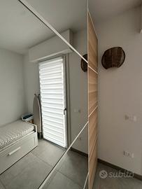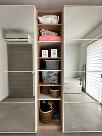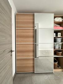 Vendo splendido armadio Ikea Pax Il set è stato acquistato nuovo nel 2024 (fattura disponibile). Richiesti: 1100,00€ ARMADIO IKEA PAX Misure: 350x225x65 cm (modulare) - realizzato su misura. Il modulo composto da due blocchi e una scaffaliera divisoria centrale.Doppia anta scorrevole, di cui una a specchio (76 x 235). Colore bianco e betulla, con rifiniture bianco. Valore d’acquisto 1400,00€ BLOCCO 1 Misure: 150x235x65 cm Accessori: lato sinistro due ripiani con porta abiti e rastrelliera estraibile per i pantaloni. Lato destro due ripiani con appendiabiti e quattro cassetti estraibili (68x55cm) SCAFFALIERA Misure: 50x235x60 cm Accessori: con 6 ripiani modulabili in altezza a seconda delle preferenze in colore alternato betulla e bianco. BLOCCO 2 150x235x65 Accessori: lato sinistro due appendiabiti con un ripiano. Lato destro 4 ripiani e rastrelliera estraibile per i pantaloni e quattro cassetti estraibili.