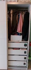 armadio Ikea con ante scorrevoli bianco lucido, base bianca. h 202cm p 60cm lunghezza 150cm da un lato asta per appendere i panni e 4 cassetti, dall'altro 4 ripiani di cui uno scorrevole