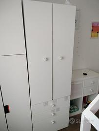 Armadio Ikea Platsa, dim. 180 x 60 x 58 (profondità). Colore Bianco, maniglie acquistate a parte. Composto da: nella parte inferiore due cassetti piccoli e un cassettone, appendiabiti e due ripiani nella parte superiore. (Disponibile da fine marzo).