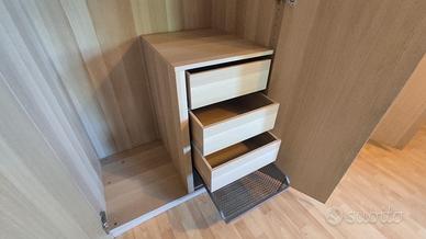 Armadio Ikea modello PAX quattro ante, con sei cassetti (tre grandi, tre piccoli), barra per appendere abiti e appendi sciarpe/borse estraibile. Presenta due piccoli difetti sul lato destro inferiore, come da foto. prezzo leggermente trattabile.