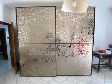 Vendo armadio Imab Group della serie Continuo, dallo stile moderno ed elegante, caratterizzato da una solida struttura in rovere moro e ante scorrevoli con specchio bronzato decorato con motivo a rose.