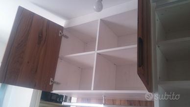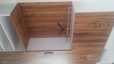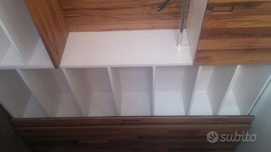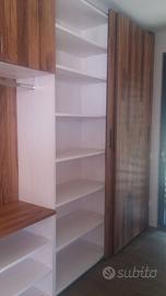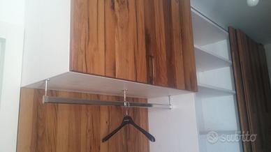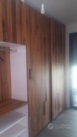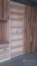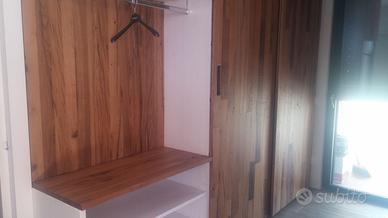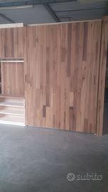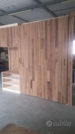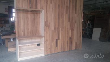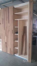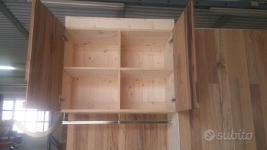 Armadio in abete massello x la struttura misure lungh.290 profondità 50 altezza 267 con 2 ante scorrevoli ammortizzate in ROVERE VECCHIO RECUPERATO DA TRAVI venature verticali PARQUETTATO a 3 strati in modo che non si incurvi nel tempo, raddrizzanti interni e maniglia ad incasso. a dx 1 ripiano aggiustabile e 1 fisso parte superiore dx porta scope e sx 4 ripiani aggiustabili. modulo centrale con 6 ripiani aggiustabili, ultimo modulo a giorno con base porta scarpe basso e coperta in ROVERE VECCHIO h 80 cm con 2 ripiani. Sopra un pensile con h 70 prof. 50 lungh circa 100 con 2 ante IN ROVERE VECCHIO su cerniere regolabili ammortizzate interno 1 ripiano e attaccaglie posteriori. Sotto pensile tubo in acciaio con supporti per appendere e schienale a 3 strati per supporto e non si rovina il muro. Schienale in abete da 14 mm, finitura sbiancata su abete ed effetto grezzo per ante. Iva non comprendente, costruito su commissione, non è disponibile a magazzino ma possiamo riprodurlo DIRETTAMENTE dal falegname produttore, astenersi affaristi perditempo e commercianti