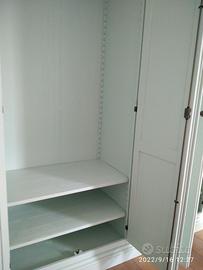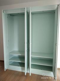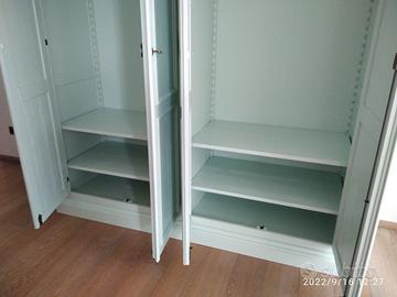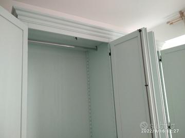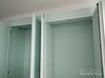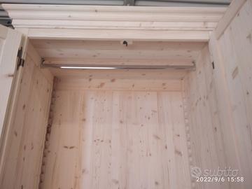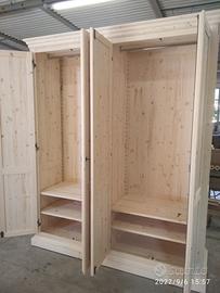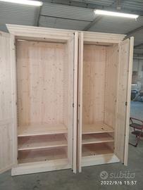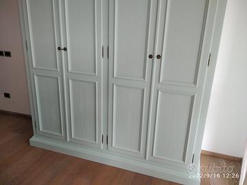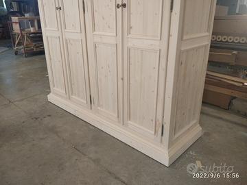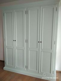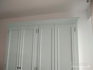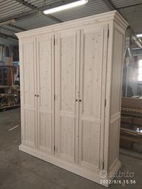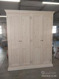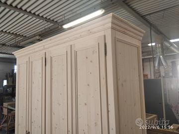 armadio in massello di abete spazzolato, con misura lungh. 200 prof. 65 h 250 con zoccolo chiuso sotto e sopra 4 ante costruite a telaio pannello liscio e varie cornici tutto in massello di abete, 2 ante a dx e 2 sx, apertura su cerniere in stile e serratura ad asta, parte interna con scalette cremagliere per avere 2 ripiani a sx e 2 a dx parte da 24 mm con bastone in alluminio a dx e sx, cappello superiore con varie cornici modanate. Schienale posteriore da 14 con fascia alle estremità, chiusura con scrocchetto sotto e sopra per le ante di sx unione con spine in legno e ferro con vari barilotti tutto smontabile. Finitura laccata coprente azzurro. Compreso finitura Iva non comprendente, costruito su commissione, non è disponibile a magazzino ma possiamo riprodurlo DIRETTAMENTE DAL PRODUTTORE ASTENERSI RIVENDITORI O COMMERCIANTI