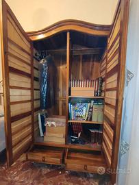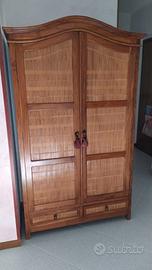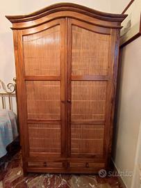 Vendo bellissimo armadio in legno massello con ante battenti cannettate in bambù e due capienti cassetti. La parte superiore è arrotondata. Internamente asta appendi abiti e mensole di legno massello.