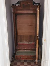 Armadio in legno antico con specchio + cassetto. Periodo fine '800/inizi '900. Misure: circa 215 cm altezza, 111 cm lunghezza, 45 cm profondità. Preferibilmente ritiro a L'Aquila. Per spedire in altre città limitrofe ci sarà da accordarsi e trovare un modo.