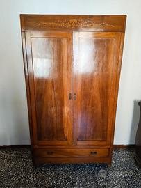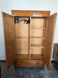 Materiale: Legno chiaro (probabilmente ciliegio o noce biondo), interno con asta appendiabiti e ripiani Stile: Liberty / inizio '900 — intarsio floreale sul frontale superiore Condizioni: Buone — legno lucido, cerniere funzionanti Misure indicative: H ~200 cm, L ~110 cm (da misurare)
