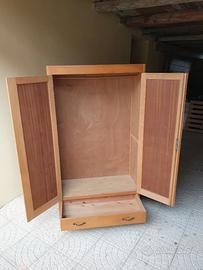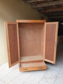 Armadio a due ante in legno massello chiaro con cassetto inferiore, maniglie in metallo lavorato, ante battenti con pannelli centrali con venature decorative, struttura solida.