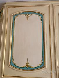 Armadio di falegnameria, dipinto a mano, con delicate dorature. 10 ante, 4 cassetti e uno specchio all’interno di un’anta. Misure 298*260h