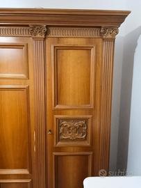 Armadio in legno massello ( probabilmente noce biondo o rovere, non ricordo con esattezza ), anni ‘70, realizzato artigianalmente. L’ armadio è a 6 ante ( a pannelli), con motivi decorativi intarsiati.
