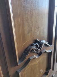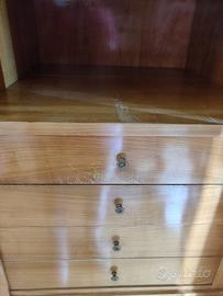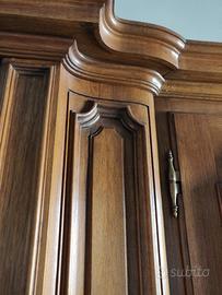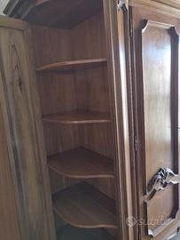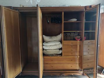 armadio in legno massello con leggeri segni di usura (come mostrato in foto). 270x71x200cm. all'interno due scomparti laterali a ripiani, uno con bastone appendiabiti, e uno con bastone e cassetti.