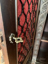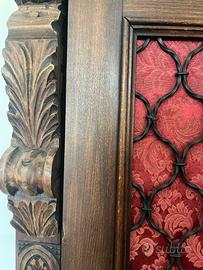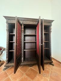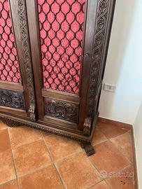 Vendo armadio in legno massello, con finiture scolpite a mano e pannelli interni rivestiti in tessuto rosso. Mobile di grande presenza scenica, ideale per chi ama lo stile classico, vintage o per ambienti importanti come ingressi, studi, salotti o stanze d’epoca.