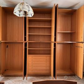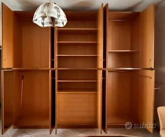 Vendo bellissimo armadio a muro a 6 ante (3 superiori + 3 inferiori) in legno di ciliegio con venature molto belle e calde. Composizione interna: • 2 moduli laterali con asta appendiabiti completa • Modulo centrale con 5 ripiani regolabili + cassettiera da 5 cassetti. Misure: lunghezza 3,12 m, profondità 61,5 , altezza 2,82 cm. L’armadio è in ottime condizioni. Prezzo trattabile