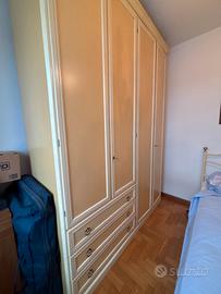 Armadio in legno shabby chic crema e panna con tre cassetti e due scomparti diviso in quattro sezioni, come nuovo, non presenta difetti. Misure Altezza 253 cm Larghezza 191 cm Profondità 54 cm