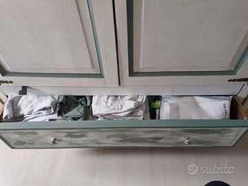 Armadio in legno stile arte povera, restaurato con finitura bianco decapato e dettagli verde salvia. Composto da due ante e cassetto inferiore, capiente e in ottime condizioni. Ideale per camera da letto o casa di campagna.