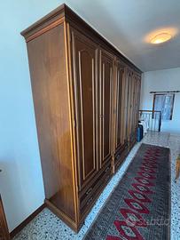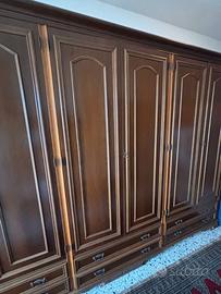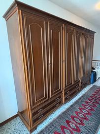 Vendo armadio in legno massello dallo stile classico, composto da più ante verticali con eleganti pannellature sagomate e finitura color noce.