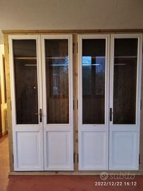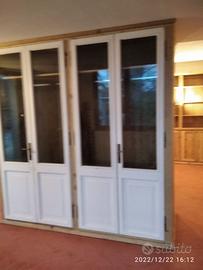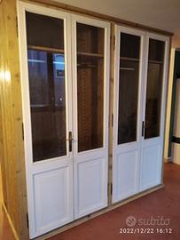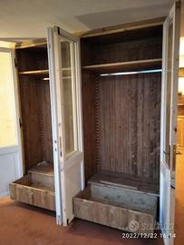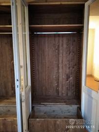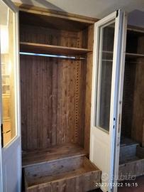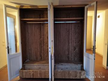 armadio da centro in abete vecchio (parti esterne a vista) recuperato da travi parancole e assi da muratore restaurate e spazzolato in modo che sia morbido al tatto con misura lunghezza 230 prof.60 h 235 predisposto TUTTA LA PARTE INTERNA e la parte posteriore schienale IN ABETE MASSELLO NUOVO mentre i 2 fianchi esterni e le spallette frontali saranno in abete vecchio in pattina, sotto zoccolo h 6 cm con piedini livellatori per mettere a bolla il tutto, appena sopra il fondo da 18 mm troveremo 2 cassetti (1 a dx e 1 a sx) che scorreranno su guide ammortizzate in chiusura interno cassetto in abete con frontale che si aprirà su maniglietta ad incasso. Bastone porta abiti in alluminio (1 dx e 1 sx) e 1 ripiano dx e 1 sx aggiustabili in altezza con CREMAGLIERA IN LEGNO NASCOSTO DALLA SPALLETTA FRONTALE IN PATTINA DI LEGNO VECCHIO. schienale autoportante da 14 mm con fascia alle estremità in modo da dare robustezza al tutto e resti dritto nel tempo. Varia ferramenta di fissaggio barilotti perni e giunzioni per assemblaggio tutto smontato. COMPLETO DI LAVORAZIONE SU VS PORTE DA TAGLIARE IN ALTEZZA E SISTEMAZIONE CON CERNIERE IN STILE CON FATTEZZA DI QUELLE ESISTENTI, COMPLETO DI SERRATURA mancante E MANIGLIA recuperata da porta rimanente e scrocco sulla porta opposta. Completo di finitura CERATA NEUTRA SU LEGNO VECCHIO E NOCE SCURO SU ABETE VECCHIO. costruito su commissione ed esigenze del cliente, non è disponibile a magazzino ma essendo i diretti produttori falegnami possiamo riprodurlo uguale o in base alle proprie esigenze. per domande o dubbi contattateci P.S. disponibili a dare suggerimenti o chiarimenti in merito, per noi conta dare vita al vostro sogno DIRETTAMENTE DAL PRODUTTORE ASTENERSI RIVENDITORI O COMMERCIANTI