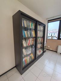 Armadio metallico con ante scorrevoli in vetro temperato dotato di 4 + 4 ripiani. Interamente in lamiera di acciaio, smontabile. Dimensioni H=200 cm; L=160 cm; P=45 cm. Perfetto per libreria da studio. Da smontare e portare via.