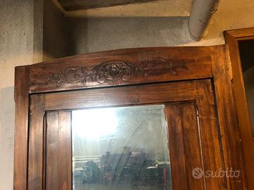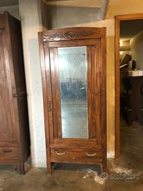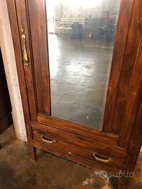 Vendo armadio antico in stile Liberty con anta a specchio in legno di noce, risalente ai primi del ‘900. Caratterizzato da linee classiche, intagli decorativi e ampio cassetto inferiore Misure 197x82x49 Da ristrutturare