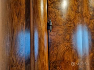 Bellissimo armadio in radica, in perfetto stile Umbertino o Barocco, realizzato in legno di noce con sapiente impiallacciatura in radica. Il frontale curvo con vetrina centrale alternata a ante cieche crea un effetto scenografico raffinato. I piedini sagomati, dettagli intagliati e una finitura originale ben conservata ne accentuano il valore estetico.
