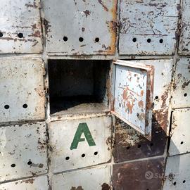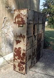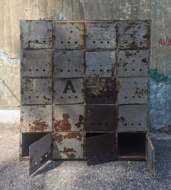Armadietti industriali, sec. XX in lamina metallica, fronte a 20 sportelli quadrati, cm 162x40 h 175, difetti