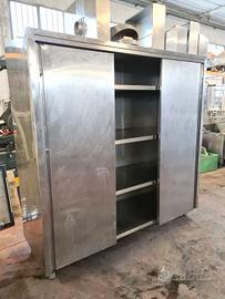 armadio inox a tre ante scorrevoli usato, si tratta di un armadio con ante scorrevoli e ripiani interni in acciaio inossidabile adatto per lo stoccaggio di pentole, piatti, attrezzature, cibi confezionati, etc. in laboratori alimentari.