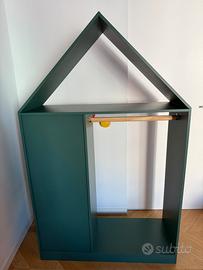 • Struttura in MDF e asta appendiabiti in pino massello • Finitura acrilica (base acqua) • Forma di casetta • 1 spazio guardaroba: 4 ripiani • 1 spazio appendiabiti: 1 barra appendiabiti • Larghezza: 104,5 cm • Altezza: 170 cm • Profondità: 40 cm