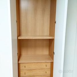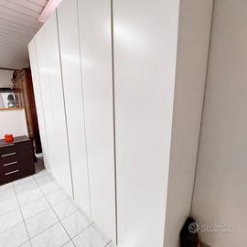 Armadio 6 ante in legno tamburato completo di attrezzatura interna (cassettiera interna, ripiani e barre appendiabiti) e porte, sempre in legno tamburato, laccate bianco opaco con maniglia incassata a tutta lunghezza della porta.