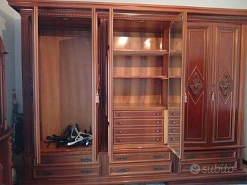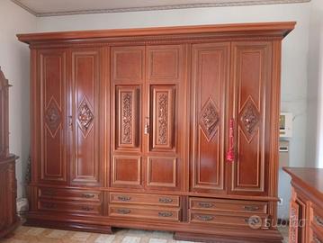 Armadio in legno color noce con applicazioni in massello, sei ante, sei cassetti esterni e quattro cassetti interni. Misura 310x60 cm, altezza 240 cm. Trasporto e smontaggio a carico di acquirente. Ritiro a domicilio