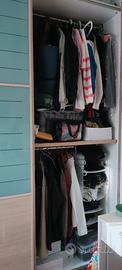 Armadio in legno di rovere sbiancato con ante scorrevoli. Le ante sono in legno e vetro temperato. Due scomparti interni, uno con un ripiano e due bastoni, l' altro con due ripiani, un bastone e una cassettiera aggiunta a posteriori con un cassetto rotto.