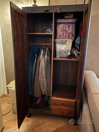 Armadio legno scuro, molto robusto. Ideale per ingresso o disimpegno. H 180 l 90 p 53 cm Anta sx ripiano e barra appendiabiti, anta dx due ripiani e due cassetti. Ritiro a carico dell’acquirente