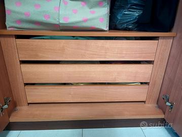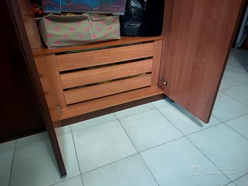 Vendo elegante armadio a 5 Ante in legno, colore noce, pomelli dorati. OTTIME condizioni. Altezza 2.50m Larghezza 2.25m Profondità 60cm All'interno sono presenti due cassettiere da 4 cassetti l'una, barra appendi-abiti (2 nell'anta di mezzo) e scaffale.