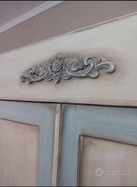 Vendo armadio in legno shabbato, color avorio e dettagli in azzurro. l'interno è stato rivestito con carta da parati con motivi floreali blu,restyling effettuato con vernici a gesso ecologiche finitura a cera.In ottime condizioni. Zona Ardea con possibilità di trasporto.