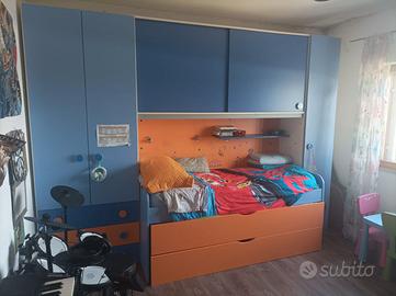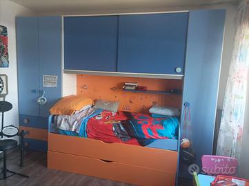 Letto a ponte bicolore (Blu,Arancio) con tre letti ad una piazza.Due armadi laterali con due ante a Sx e un'anta a DX + ripostiglio superiore per giocattoli/biancheria ad ante scorrevoli. Tre cassetti nella parte bassa a Sx. Due mensole blu all'interno del ponte,vicino al letto superiore (da foto è visibile solo una)