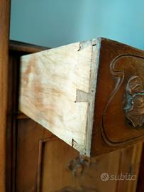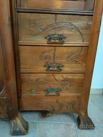 Armadio–comò Liberty dei primi del ’900, realizzato interamente in noce massello piemontese. Ricchi intagli floreali con narcisi, piedini scolpiti e specchiera originale molata. Struttura di alta qualità artigianale con giunzioni a coda di rondine, retro anch’esso in noce e un ampio cassettone interno sempre in noce massello.