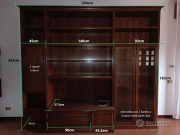 Libreria in legno massello tenuta in perfette condizioni con vetrinetta illuminata da 2 faretti a incasso. Misure: