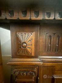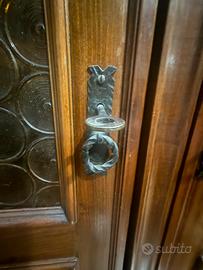 Antico armadio - libreria in legno intagliato, con "zampe di leone" e vetro color ocra . Misure: altezza 155 cm larghezza 114cm (senza "zampe")profondità 49cm, Ritiro e trasporto a carico dell’acquirente zona portaportese