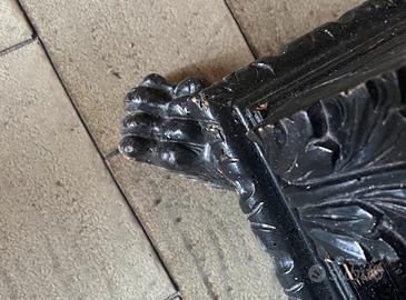 Armadio libreria Rinascimentale in legno massello colore nero con intarsi eseguiti interamente a mano oltre ad antine con interni a roselline in ferro battuto, piedi a leoncino. Ripiani con stoffa originale. SOLO RITIRO NO SPEDIZIONE.