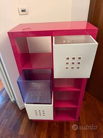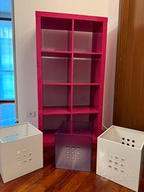 Scaffale libreria mod Kallax colore fucsia non più in produzione. Misure 79x149.5x39. I tre contenitori sono compresi (due bianchi, uno trasparente). Il mobile può essere utilizzato in verticale o in orizzontale. Considerate le misure non si effettua spedizione.