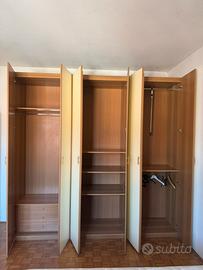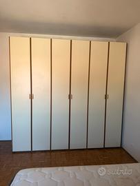 Armadio 6 ante, color crema bordato in legno. Lunghezza 266cm, profondità 60cm, altezza 259cm. Interni rifiniti in ciliegio, come da foto. Larghezza singola anta 44cm. Profondità interna 57cm. Consegna a mano presso l’appartamento. L’armadio è ancora montato.