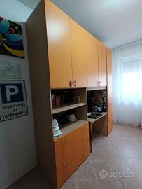 Armadio come da foto già smontato con tre scomparti, cassettiera, e due vani scoperti. senza la scrivania.