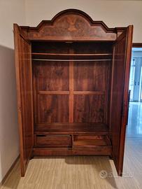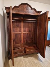 Vendo armadio stile Luigi Filippo della prima metà del 1800, lastronato in radica di noce, con richiami al '500 nei decori angolari raffiguranti leoni e foglie.