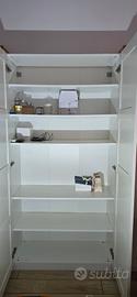 Quattro armadi industriali (dimensioni individuali L100 H200 P40 cm) decorati sulle porte laccate bianche con inserti in pelle color cognac.