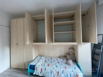 Armadio 9 ante più 4 cassetti in legno con pomelli grigi. Usata ma in ottime condizioni. (Letto sotto non incluso, ma è inclusa una struttura con piedini e rete da una piazza e mezza). Eventualmente possimao farlo trovare già smontato ma il ritiro è a carico dell’acquirente.