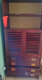 Mobile 1: Libreria / Comò con Ante a Gelosia Questo versatile mobile combina una parte superiore a libreria con due ampi ripiani a vista e una parte inferiore dotata di due ante a gelosia (stile persiana) e tre cassetti spaziosi. I dettagli in ottone (maniglie e angoli sui cassetti) aggiungono un tocco classico e raffinato. Perfetto per il soggiorno, uno studio o anche in una camera da letto.