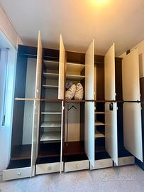 Vendo per rinnovo arredo capiente armadio modulare. L’armadio é composto da 5 moduli gemelli, estremamente versatile ed in ottime condizioni. Dimensioni: - larghezza 287 cm - altezza 283 cm - profondita 59 cm (54 cm interno) 10 ante doppie e 5 cassetti L’armadio è solido, pulito e con cerniere perfettamente funzionanti. Design sobrio in bianco con profili scuri, adatto a camere da letto, corridoi o ampi ripostigli. Smontaggio e trasporto a carico dell'acquirente. Disponibile da subito. Valuto offerte.