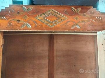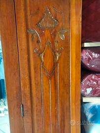 Armadio guardaroba antico, in buone condizioni completo di sportello e specchio. Le misure sono 195 x 50 x 115 Necessita di qualche lavoro. All'interno e presente l'appendiabiti e il supporto per montaggio di eventuali mensole. Presenta nella parte bassa un cassetto che misura 106 x 45 x 19. Sportello centrale che misura 133 x 58 e specchio che presenta macchie del tempo. Negli anni è stata aggiunta qualche striscia di compensato al tetto dell'armadio