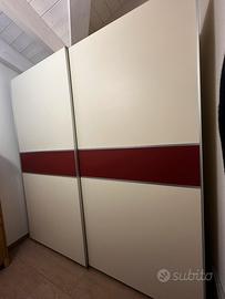 Vendo splendido armadio a due ante scorrevoli dal design moderno e lineare, perfetto per camere da letto o corridoi spaziosi. L’armadio presenta una finitura color panna/beige chiaro con un'elegante fascia centrale a contrasto color rosso bordeaux. Il mobile è molto robusto e offre una grandissima capacità di contenimento grazie all'altezza generosa. Dimensioni: Altezza: 260 cm Larghezza: 240 cm Profondità: 65 cm Smontaggio e Trasporto a carico dell’acquirente.
