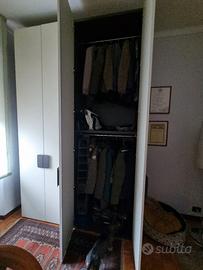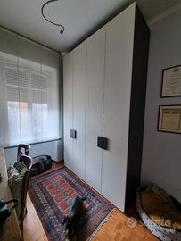 Armadio moderno con ante a battente caratterizzato da un design pulito, ante bianche e maniglie scure di forma rettangolare. Altezza più di 2.70, profondità 60 cm, larghezza 180 cm, anta 44,5 cm. Condizioni buone.