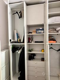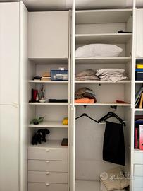 Struttura molto capiente e versatile, ideale per camera, studio o cameretta. Composta da: * armadiatura con vano appendiabiti e ripiani interni * colonne laterali con scaffali a vista * numerosi cassetti contenitivi * pensili superiori * scrivania angolare integrata Colore bianco opaco, linea pulita e moderna. Dimensioni 374 cm di larghezza 260 di altezza e profondità da 37 a 60 cm nel punto più profondo. Realizzato in maniera artigianale legno massello. Condizioni buone, struttura solida, presenti normali segni d’uso compatibili con il tempo. Vendita preferibilmente con ritiro e smontaggio a carico dell’acquirente.